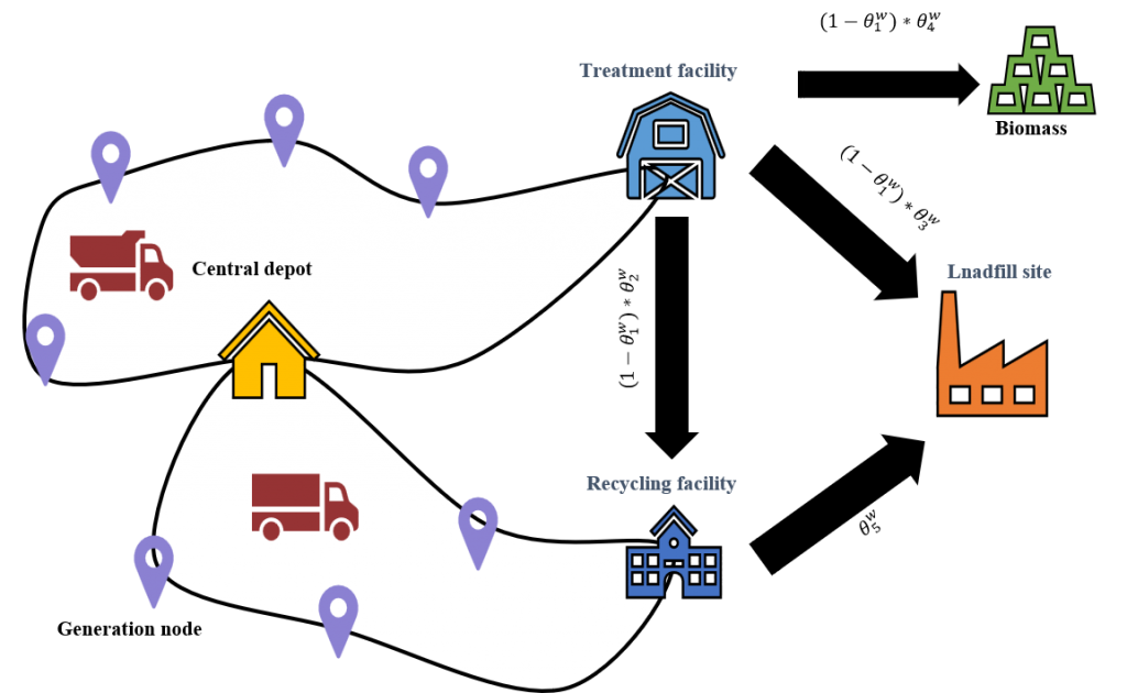 ABSTRACT: This study expands the multi-objective math model for urban waste management, which includes integrated three-level automation routing decisions, cost optimization, and maximization of produced biogas. Analyzing these decisions simultaneously may not only lead to an effective structure in the waste management network, it may also reduce the potential risk of waste management. In addition, due to the inherent complexity of the waste management system, uncertainty is inevitable, and the process must be considered as probable to ensure assurance in the decision-making process. In this research, the amount of pollution produced by waste collection machines as well as the amount of energy produced from the process of waste conversion to biogas is considered. Finally, considering the three factors of cost, pollution and production of biogas, we seek to find the best result in a reasonable time.