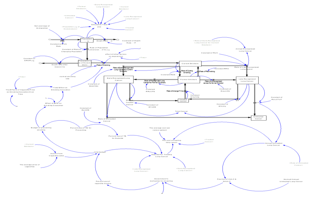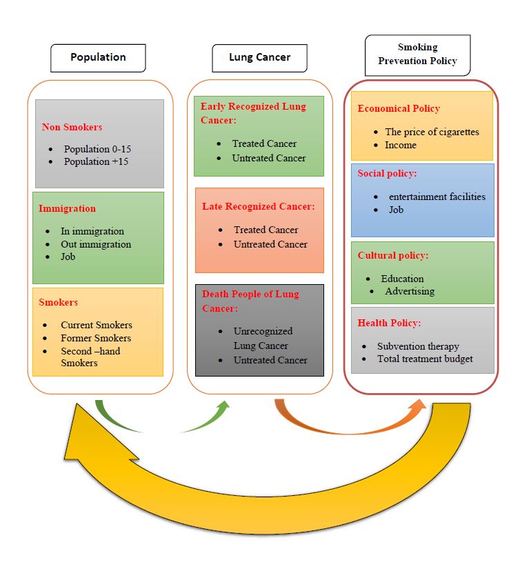 ABSTRACT: Nowadays, lung cancer is the deadliest and the most common type of cancer regardless of the gender factor according to global statistics. This has led to the reality that the death rate from lung cancer has risen sharply in recent years. Cigarette smoking is one of the most important causes of lung cancer and the association between cigarettes and lung cancer has been proven by large cohort studies. In this paper, the system dynamics approach is used as the main methodology. We have created a system dynamic model to analyse the relationship between smoking and lung cancer and to study factors such as the rate of smoking, death rate because of lung cancer, lung cancer treatment and costs, the impact of investment and budget allocation in different sectors by government, social welfare level of individuals, etc.